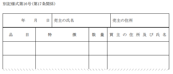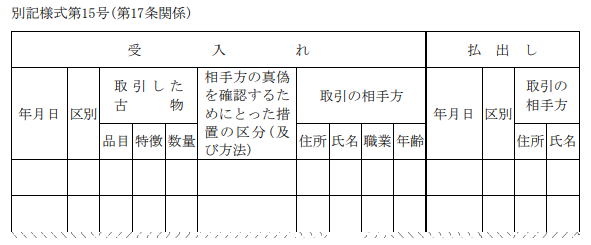記載をする帳簿の様式は『古物営業法施行規則 別記様式第15号及び別記様式第16号』に定められています。